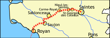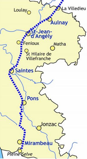 Il fait son entrée dans notre département en Saintonge, à La Villedieu. Il traverse Aulnay, Saint-Jean-d’Angély, Saintes, Pons puis l’abbaye de la Tenaille à Saint-Sigismond-de-Clermont, avant d’atteindre les rives de la Gironde.