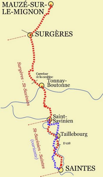 Nous avons donc réalisé un parcours Surgères-Taillebourg-Saintes. Il présente trois avantages : 17 km de moins, les possibilités d’hébergement sont plus nombreuses, ce qui permet de le couper en 3 étapes éventuellement et de découvrir la Charente, ses beaux paysages et ses châteaux.